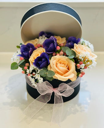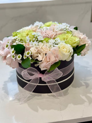 Fill a hat Boxes with fresh flowers. This makes a gorgeous gift that really lasts. All my hat boxes come in different colours & sizes and can be filled with any type of fresh flower. Prices start at £50.